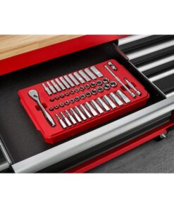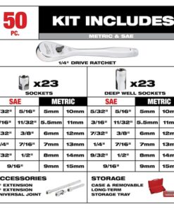 MILWAUKEE SAE 50 piece 1/4″ drive Ratchet & Socket set is designed from the ground up, offering users the Most Versatile Sockets that are Anti-Roll and Wrench-Ready. Its innovative FOUR FLAT Sides feature an anti-roll and wrench-ready design. The 90 tooth ratchet tool offers 4?? of arc swing and a slim profile design, allowing you to work in tighter and more confined spaces, be it under the hood of a car or in the middle of a remodel. The ratchet and socket kit comes with a removable inner tray which is perfectly designed to be stored long-term in a steel storage chest. All of sockets are stamped with SAE and metric measurements on the flat side for easy-to-read visibility. It also comes with a durable carrying case for ultimate portability. The set comes with accessories included so that users can get every job done, both in the garage and on the jobsite. ratchet and socket set is backed by Lifetime Guarantee.