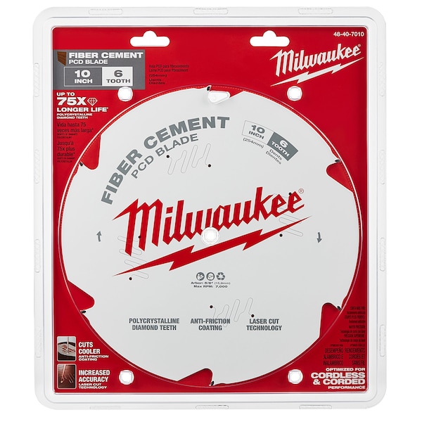 Circular Saw Blade, Series 48-40, Blade Dia. 10 in, Max. Blade Speed 7,000 RPM, Arbor Size 5/8 in, Arbor Shape Round, Diamond Knockout Diamond Knockout Included, Number of Teeth 6, Max. Cutting Depth 4 in, Primary Material Application Fiber Cement, Materials Cut Fiber Cement, Metal Cutting Type Not Applicable, Wood Cutting Type Not Applicable, Cut Width 0.08 in, Tip Material Carbide, Hook Angle 10 Degrees , Tooth Grind FTG, For Use With Saw Type Circular Saws, Blade Type Fiber Cement