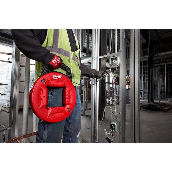 Fish Tape, Tape End Style Leader, Tape Length 100 ft, Tape Material Polyester, Tape Shape Spiral, Case Winding Type Internal Rotating, Tape Diameter 7/32 in, Tape Tensile Strength Not Applicable, Case Diameter 13 in, Voltage Rating Not Applicable, Case Style Winder Slide, Features Anti-Catch Tip, Easiest Fishing Durable Tape, Flexible Metal Leader, High Flexibility, Low Friction Case, Multi-Position Handle, Square Inner Grip, Triple Strand Design, Tape Finish Polyester, Tape Width 23/100 in