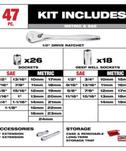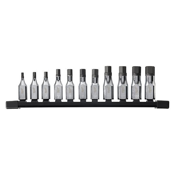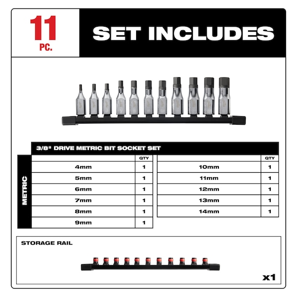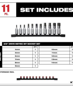 The MILWAUKEE 11PC 3/8″ Drive Metric Hex Bit Socket Set with FOUR FLAT sides is designed from the ground up to be part of the most versatile socket family. Milwaukee bit sockets feature an innovative design with four parallel flat sides, which deter rolling and are wrench-compatible. This also creates a slim profile to provide the best access in tight spaces. The one-piece socket design offers improved durability compared to two-piece designs by eliminating the risk of the bit separating from the socket base. This set includes a storage rail for better organization. Laser engraved size markings provide easy identification and chrome plating offers rust and corrosion protection. All Milwaukee bit sockets are backed by a Lifetime Guarantee.
