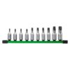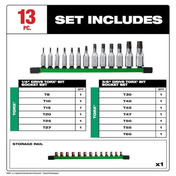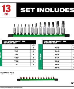 The MILWAUKEE 13PC 1/4″ and 3/8″ Drive TORX Bit Socket Set with FOUR FLAT sides is designed from the ground up to be part of the most versatile socket family. Milwaukee bit sockets feature an innovative design with four parallel flat sides, which deter rolling and are wrench-compatible. This also creates a slim profile to provide the best access in tight spaces. The one-piece socket design offers improved durability compared to two-piece designs by eliminating the risk of the bit separating from the socket base. This set includes a storage rail for better organization. Laser engraved size markings provide easy identification and chrome plating offers rust and corrosion protection. All Milwaukee bit sockets are backed by a Lifetime Guarantee.