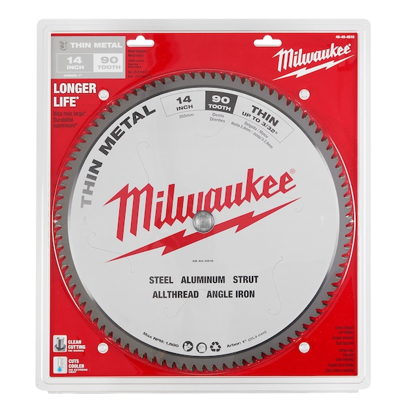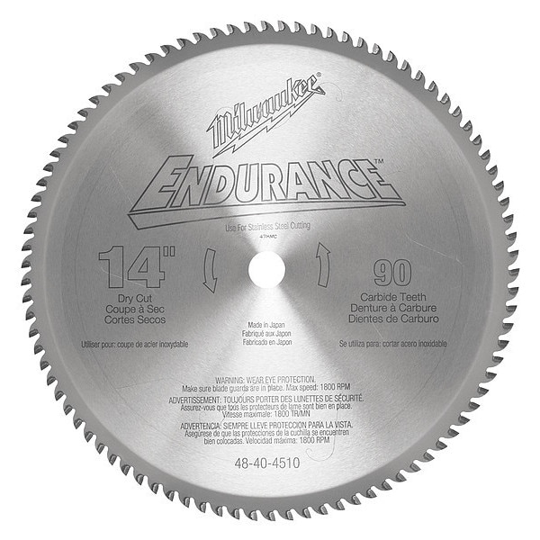 Circular Saw Blade, Blade Dia. 14 in, Arbor Size 1 in, Arbor Shape Round, Diamond Knockout Diamond Knockout Not Included, Number of Teeth 90, Primary Material Application Thin Metal, Materials Cut Ferrous Metals, Non-Ferrous Metals, Metal Cutting Type Thin Metal, Wood Cutting Type Not Applicable, Blade Thickness 0.094 in, Cut Width 0.09 in, Tip Material Carbide, Hook Angle 10 Degrees , Tooth Grind ATB, For Use With Saw Type Circular Saws, Application Metal Cutting
