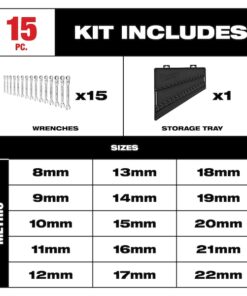 Combination Wrench Set, Steel, Chrome Vanadium, Number of Tools 15, Range of Head Sizes 8 mm to 22 mm, Head Offset Angle 0 Degrees , Flexible, Tray, Metric, 8 mm, 9 mm, 10 mm, 11 mm, 12 mm, 13 mm, 14 mm, 15 mm, 16 mm, 17 mm, 18 mm, 19 mm, 20 mm, 21 mm, 22 mm, Rounded, Opening Angle (Deg.) 0 Degrees