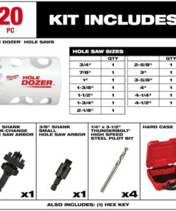 HOLE DOZER 20-Piece Bi-Metal Hole Saw kit features a new 3.5 TPI tooth design that offers you the longest life in metal applications. These MILWAUKEE HOLE DOZER Bi-Metal Hole Saws feature the industry’s only Lifetime Tooth Break Warranty and can take on all general purpose applications, making them the most durable hole saws. ALL-ACCESS SLOTS solve the frustration of plug removal, making you more productive with less downtime between holes. The new slot design also gives you increased pilot visibility for accurate placement and faster chip ejection keeping your cut cool. HOLE DOZER Thermoset Coating allows for faster cutting and is optimized for cordless tools, delivering you 25% more holes per charge. HOLE DOZER Bi-Metal hole saws are proudly made in the USA. This hole saw kit also includes a case, which offers you enhanced customization capability thanks to the interchangeable pegs. You can store arbors, pilot bits, and more in the removable accessory box or remove it entirely to create more space for hole saws. Each Milwaukee Hole Saw Case features a reinforced grid design on the top and bottom, plus heavy-duty latches, securely storing the hole saws within this durable, hard case design.