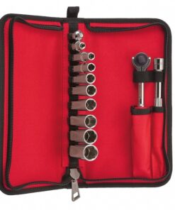 A socket wrench set consists of a handle or wrench with a ratcheting mechanism and interchangeable sockets of different sizes. This versatile tool enables users to tighten or loosen nuts and bolts efficiently, offering adaptability and convenience across a wide range of applications.