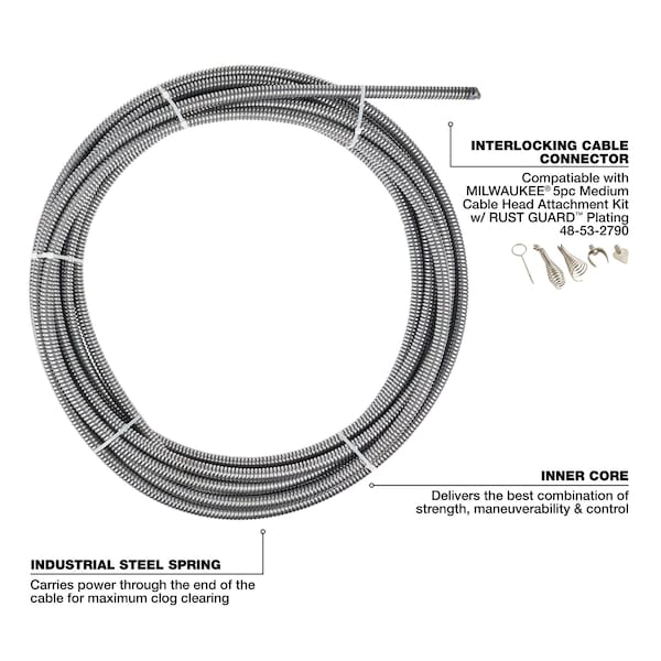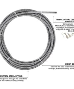 Drain Cleaning Cable, Product Type Inner Core Drum Cable, Compatible Machine Type Drum Machines, Compatible Cleaner Series M18 Drum Machines, Cable Type Drum, Maximum Drain Line Inside Diameter 1 1/2 in, Minimum Drain Line Inside Diameter 3 in, Cable Diameter 3/8 in, Cable Length 75 ft, Core Type Inner Core, Cable End Type Coupling, Application Drum Machines, Cable Material Steel, Compatible Cleaner Battery Platform M18