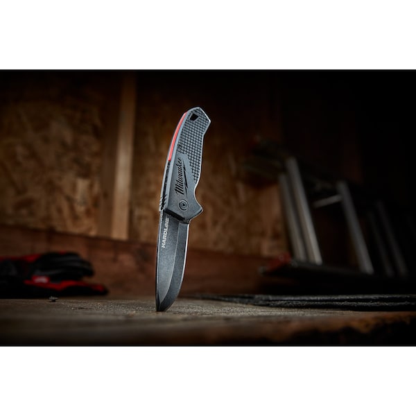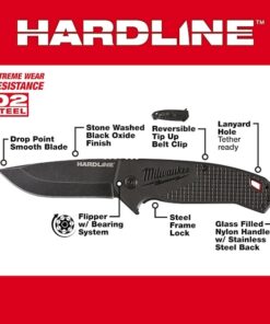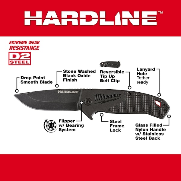 The Milwaukee 48-22-1994 3???? HARDLINE Smooth Blade Pocket Knife is a reliable tool for your toughest jobs. It features a D2 steel blade that delivers extreme wear resistance and high performance. The flipper with bearing system allows fast, smooth opening. A steel frame lock provides a strong, secure lock for tough applications. A reversible tip up belt clip allows right or left handed carry. The Milwaukee 48-22-1994 3???? HARDLINE Smooth Blade Pocket Knife is the ultimate go to knife when you need it most.