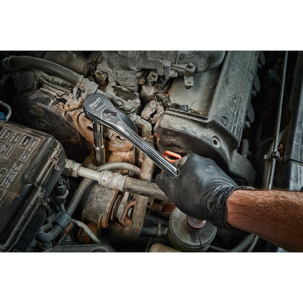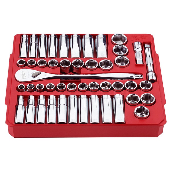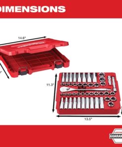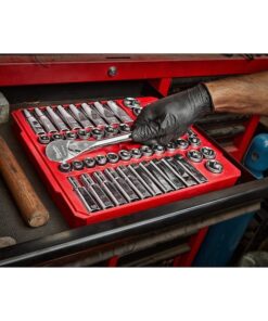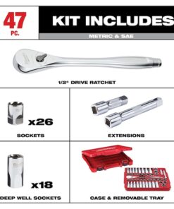 46-Piece SAE & Metric 1/2″ Drive Ratchet and Socket Set offers better access in tight spaces and maximum tool strength. The 90-tooth ratchet tool offers 4??of arc swing and a slim profile design, so you can work in tighter spaces. The MILWAUKEE socket set features an innovative wrench-compatible socket design with FOUR FLAT sides to help prevent rolling. The 1?2?? drive ratchet has sockets with sizes laser engraved into the flats for easy-to-read visibility. optimized socket geometry additionally helps reduce bolt rounding and stripping. The Milwaukee ratchet and socket set includes a removable inner designed to be stored long-term in a steel storage chest and a durable carrying case for ultimate portability. The set’s accessories guarantee you have what you need to tackle every job, both in the garage and on the jobsite. The 46 Piece SAE & Metric 1?2?? Drive Ratchet and Socket Set is backed by a lifetime guarantee.