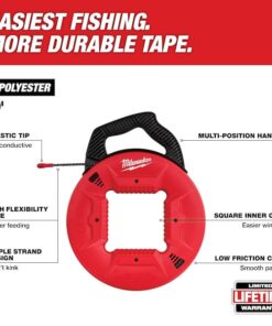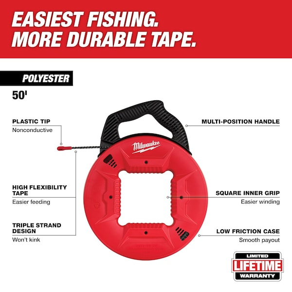 Fish Tape, Tape End Style Non-Conductive Eyelet, Tape Length 50 ft, Tape Material Polyester, Tape Shape Spiral, Case Winding Type Internal Rotating, Tape Diameter 7/32 in, Tape Tensile Strength Not Applicable, Case Diameter 13 in, Non-Conductive Yes, Voltage Rating Not Applicable, Case Style Winder Slide, Features Anti-Catch Tip, Easiest Fishing Durable Tape, High Flexibility, Low Friction Case, Multi-Position Handle, Square Inner Grip, Triple Strand Design, Tape Finish Polyester
