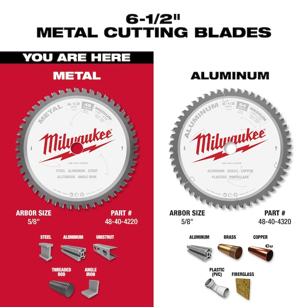 Circular Saw Blade, Blade Dia. 6 1/2 in, Arbor Size 5/8 in, Arbor Shape Round, Diamond Knockout Diamond Knockout Not Included, Number of Teeth 48, Primary Material Application Steel, Steel Alloys, Materials Cut Ferrous Metals, Non-Ferrous Metals, Metal Cutting Type Thick Metal, Wood Cutting Type Not Applicable, Blade Thickness 0.188 in, Cut Width 0.06 in, Tip Material Carbide, Hook Angle 2 Degrees , Tooth Grind ATB, For Use With Saw Type Circular Saws, Application Metal Cutting