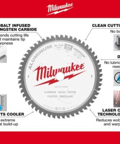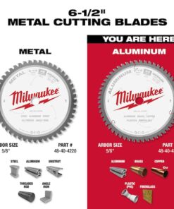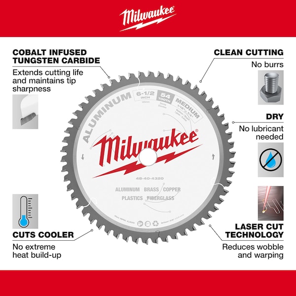 Circular Saw Blade, Blade Dia. 6 1/2 in, Arbor Size 5/8 in, Arbor Shape Round, Diamond Knockout Diamond Knockout Not Included, Number of Teeth 54, Primary Material Application Aluminum, Materials Cut Aluminum, Metal Cutting Type Thick Metal, Wood Cutting Type Not Applicable, Blade Thickness 0.25 in, Cut Width 0.07 in, Tip Material Carbide, Hook Angle -5 Degrees , Tooth Grind ATB, For Use With Saw Type Circular Saws, Application Metal Cutting
