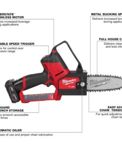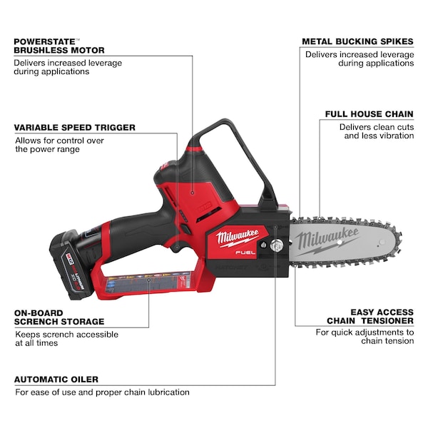 Battery-Powered Chainsaw Kit, Product Type Pruning Saw Kit, Power Source Cordless, Bar Length 6 in, Handle Location Rear Handle, Chain Oiler Automatic, Tool Weight 4.85 lb, Number of Batteries to Operate 1, Battery Capacity 4.0 Ah, Bare Tool/Battery Included Battery Included, Battery Platform M12(TM) REDLITHIUM(TM), Number of Batteries Included 1, Number of Chargers Included 1, Motor Type Brushless, Voltage 12 V, Tool Height 9 1/8 in