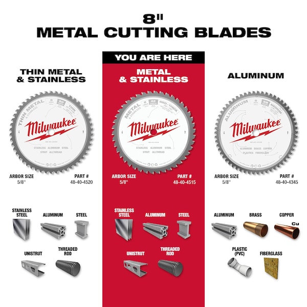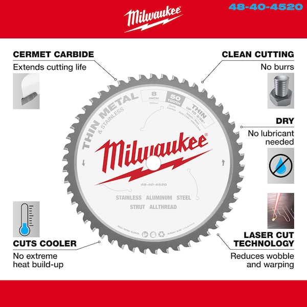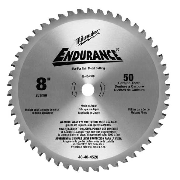 Circular Saw Blade, Series 48-40, Blade Dia. 8 in, Max. Blade Speed 5,000 RPM, Arbor Size 5/8 in, Arbor Shape Round, Diamond Knockout Diamond Knockout Not Included, Number of Teeth 50, Max. Cutting Depth 1/16 in, Primary Material Application Steel, Steel Alloys, Materials Cut Ferrous Metals, Steel, Metal Cutting Type Thin Metal, Wood Cutting Type Not Applicable, Cut Width 0.07 in, Tip Material Carbide, Hook Angle 0 Degrees , Tooth Grind M-ATB, For Use With Saw Type Circular Saws