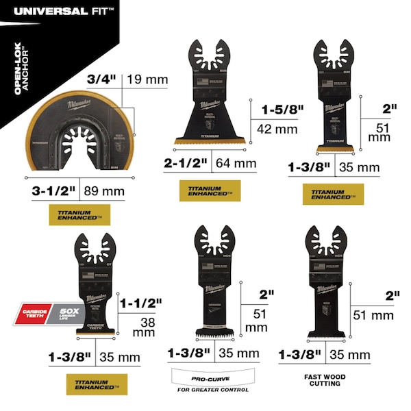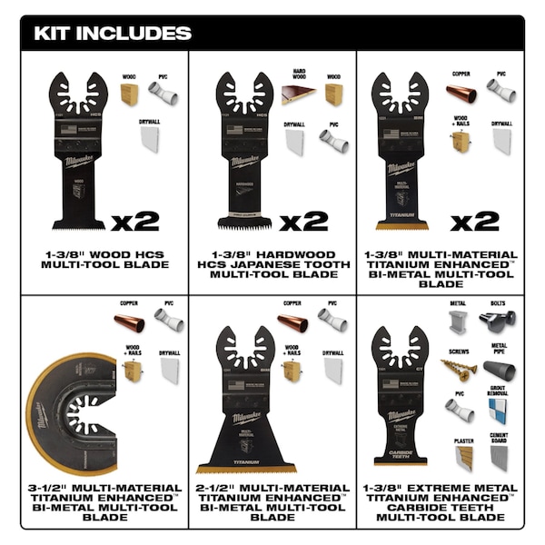 OPEN-LOK Multi-Tool Blade Variety Kit 9PC provides you with an assortment of blades for multi-material, hardwood and clean wood cutting applications. The set includes a Carbide Teeth metal blade that lasts up to 50X longer than standard bi-metal blades and can be used in a wide range of metal materials while maintaining longer blade life such as; screws, bolts, nails, and more. TITANIUM CHARGED Bi-Metal blades have an optimized titanium blend for maximum wear-resistance and up to 15x longer life vs. high carbon steel (HCS) blades. These bi-metal multi-tool blades are ideal for wood with nails, PVC, and drywall. The Triple-Ground Japanese Tooth hardwood blades deliver up to 2X faster cuts than the previous MILWAUKEE HCS blades and features a PRO-CURVE cutting edge for greater control. The Japanese Tooth blades are ideal for fast, clean cuts in hardwood and can also be used in clean wood, PVC, and drywall. The set also includes high carbon steel (HCS) blades designed with aggressive, edge-ground teeth for fast wood cutting. These blades feature a reinforced Universal Fit OPEN-LOK anchor for better strength & control and allow for quick blade changes across 100+ multi-tools. Not compatible with Starlock tools. The set is organized in a hard case for storage. MILWAUKEE oscillating multi-tool blades are designed and made in the USA with global materials.