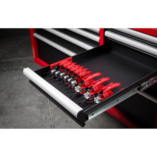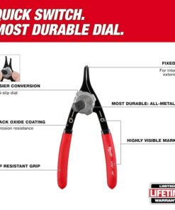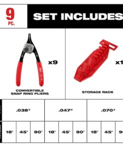 9pc Convertible Snap Ring Pliers Set features an all-metal dial that quickly switches between internal and external modes. The all-metal dial is more durable than competitors. The anti-slip dial makes it easier to convert the pliers when working with both internal and external snap rings. The all-metal dial provides the ability to withstand harsh environments. The adaptable storage rack optimizes drawer space by including a detachable handle to fit in tight spaces or carry on the go. The storage rack also includes magnets and hang holes to hang vertically when drawer space is very limited, making for the most adaptable snap ring plier storage. Convertible Snap Ring Plier Set is backed by a Limited Lifetime Warranty.