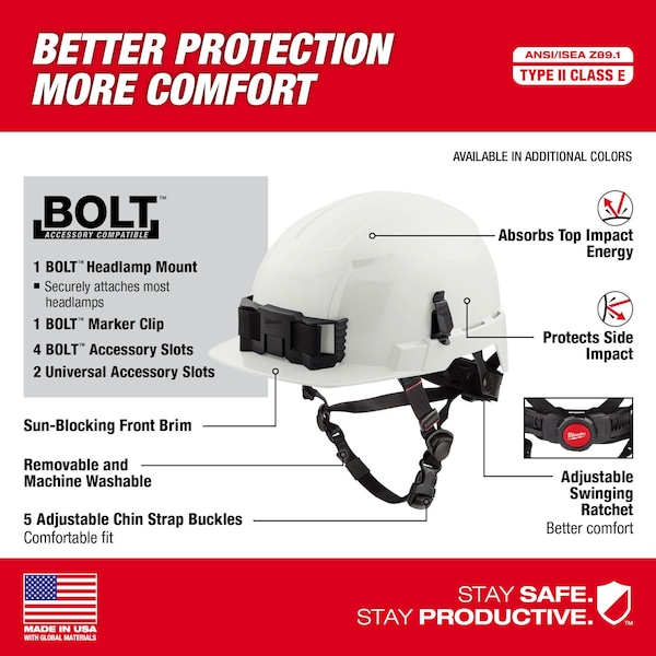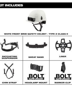 Type 2, Class E Front Brim Safety Helmets deliver you better protection and more comfort. These safety helmets offer protection from top and side impacts. These construction safety helmets are BOLT Accessory Compatible with four BOLT accessory slots and two universal accessory slots that easily integrate additional personal protection equipment and accessories so you can Secure Accessories Simultaneously. Each helmet includes a MILWAUKEE BOLT Headlamp Mount that works with most headlamps for easy, secure attachment, and a BOLT Marker Clip allows for easy access to pens and markers. The Milwaukee helmets have a comfortable padded suspension that includes an adjustable swinging ratchet for better comfort. The climbing style helmet also has a comfortably fitting five adjustable buckle chin strap for better security. An antimicrobial sweatband and helmet liner prevent odor and bacteria build up and are removable and machine washable. These safety helmets are ANSI type 2 and customizable by adding your logo.