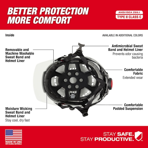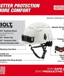 Type 2, Class C Front Brim Vented Safety Helmets deliver you better protection and more comfort. These safety helmets offer protection from top and side impacts. These construction safety helmets are BOLT Accessory Compatible with four BOLT accessory slots and two universal accessory slots that easily integrate additional personal protection equipment and accessories so you can Secure Accessories Simultaneously. Each helmet includes a MILWAUKEE BOLT Headlamp Mount that works with most headlamps for easy, secure attachment, and a BOLT Marker Clip allows for easy access to pens and markers. The Milwaukee helmets have a comfortable padded suspension that includes an adjustable swinging ratchet for better comfort. The climbing style helmet also has a comfortably fitting five adjustable buckle chin strap for better security. An antimicrobial sweatband and helmet liner prevent odor and bacteria build up and are removable and machine washable. These safety helmets are ANSI type 2 and customizable by adding your logo.