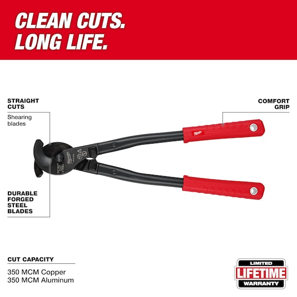 Cable Cutter, Cutting Action Straight, Features Clean Cuts, Lanyard Hole – Tether Ready, Long Life, For Maximum Diameter Hard Steel Not Applicable, For Maximum Diameter Stainless Steel Not Applicable, For Maximum Diameter ACSR Conductor Not Applicable, For Maximum Diameter Medium Steel Not Applicable, For Maximum Diameter Soft Steel Not Applicable, For Wire/Cable Type Electrical/Data Cable, For Maximum Diameter Copper Electrical Cable 350 kcmil