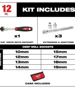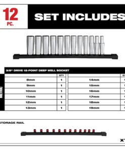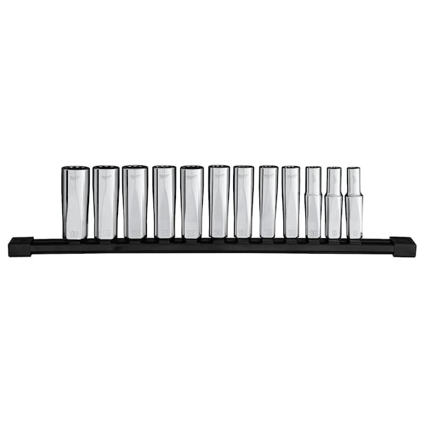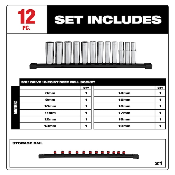 Deep Well Socket Set Metric 12pt, Standard Socket Count/Style Not Applicable, Deep Socket Count/Style (12) 12-Point, Deep Socket Style/Size Deep 12-Point: 10 mm, Deep 12-Point: 11 mm, Deep 12-Point: 12 mm, Deep 12-Point: 13 mm, Deep 12-Point: 14 mm, Deep 12-Point: 15 mm, Deep 12-Point: 16 mm, Deep 12-Point: 17 mm, Deep 12-Point: 18 mm, Deep 12-Point: 19 mm, Deep 12-Point: 8 mm, Deep 12-Point: 9 mm, Flex Socket Count/Style 0, Hand, Drive Size 3/8 in, Metric, 12-Point, Chrome