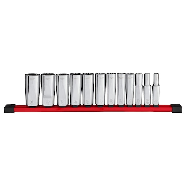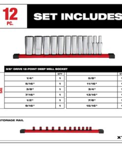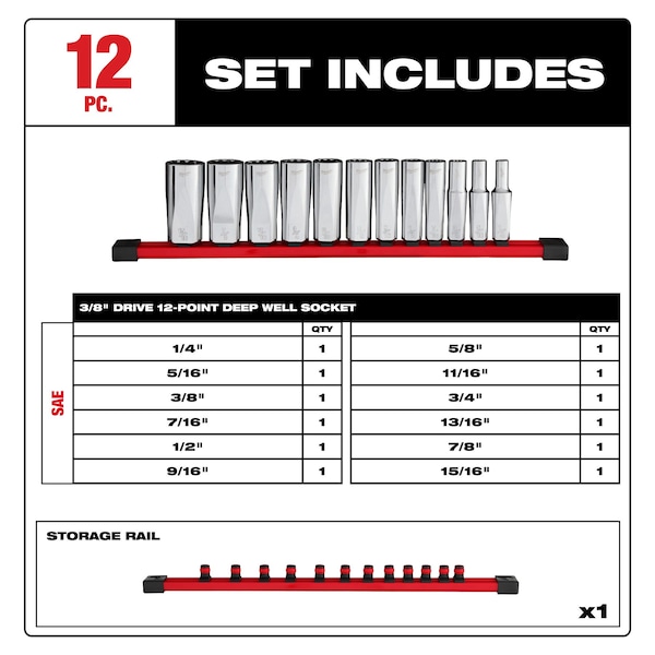 Deep Well Socket Set – SAE 12pt, Standard Socket Count/Style Not Applicable, Deep Socket Count/Style (12) 12-Point, Deep Socket Style/Size Deep 12-Point: 1/2 in, Deep 12-Point: 1/4 in, Deep 12-Point: 11/16 in, Deep 12-Point: 13/16 in, Deep 12-Point: 15/16 in, Deep 12-Point: 3/4 in, Deep 12-Point: 3/8 in, Deep 12-Point: 5/16 in, Deep 12-Point: 5/8 in, Deep 12-Point: 7/16 in, Deep 12-Point: 7/8 in, Deep 12-Point: 9/16 in, Flex Socket Count/Style 0, Hand, Drive Size 3/8 in, SAE, 12-Point, Chrome