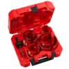 HOLE DOZER 19-Piece Electrician Hole Saw kit features a new 3.5 TPI tooth design that offers you the longest life in metal applications. These MILWAUKEE HOLE DOZER Bi-Metal Hole Saws feature the industry’s only Lifetime Tooth Break Warranty and can take on all general purpose applications, making them the most durable hole saws. ALL-ACCESS SLOTS solve the frustration of plug removal, making you more productive with less downtime between holes. The new slot design also gives you increased pilot visibility for accurate placement and faster chip ejection keeping your cut cool. HOLE DOZER Thermoset Coating allows for faster cutting and is optimized for cordless tools, delivering you 25% more holes per charge. HOLE DOZER Bi-Metal hole saws are proudly made in the USA. This hole saw kit also includes a case, which offers you enhanced customization capability thanks to the interchangeable pegs. You can store arbors, pilot bits, and more in the removable accessory box or remove it entirely to create more space for hole saws. Each Milwaukee Hole Saw Case features a reinforced grid design on the top and bottom, plus heavy-duty latches, securely storing the hole saws within this durable, hard case design.
