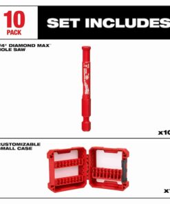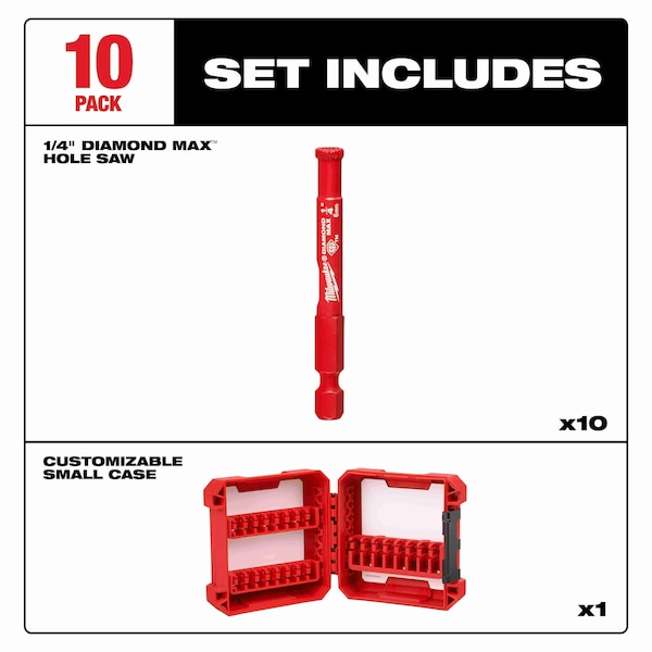 Hole Saw Set, Primary Material Application Porcelain; Tile; Stone, Materials Cut Ceramic Tile, Glass, Granite, Natural Stone, Porcelain, Arbor Design Not Applicable, Tooth Material Diamond Grit, Teeth per Inch Not Applicable, Max. Cutting Depth 1 1/2 in, Impact Rated Not Impact Rated, Hole Saw Sizes (Hole Saws) 1/4 in, Replacement Arbor Not Applicable, Thread Size Not Applicable, Shank Size Not Applicable, Pilot Drill Size Not Applicable, Number of Pieces 10