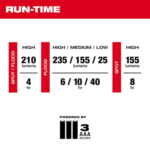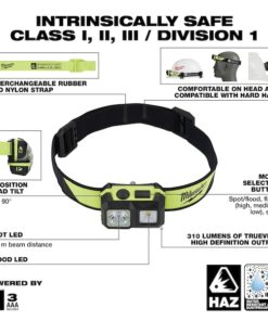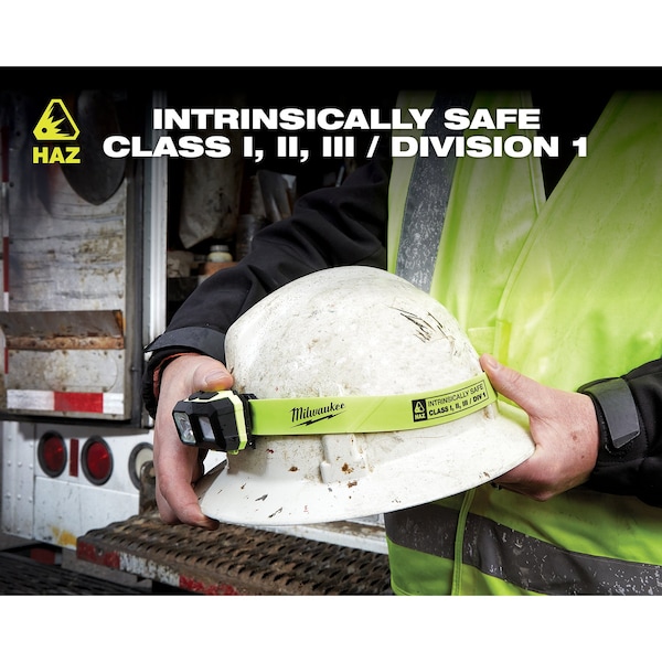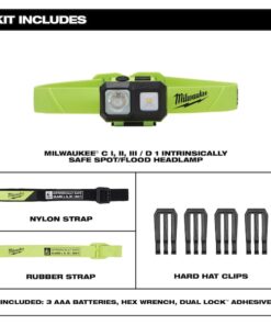 Intrinsically Safe Class I, II, & III / Division 1 Spot/Flood Headlamp sets a new standard for hazardous location personal lighting, delivering GREATER VISIBILITY, HIGHER OUTPUT, and NO COMPROMISE to size or safety. The headlamp is rated for Classes I, II, and III, Division 1, delivers you with 310 Lumens of TRUEVIEW High Definition Output, and can reach a beam distance of up to 100 meters. With a lightweight, compact design, there is no compromise to size for output and performance. Designed with the safety manager in mind, this hi-visibility headlamp has explicit on-tool and on-strap intrinsically safe logos for easy identification, even at a distance. Powered by 3 AAA batteries, this spot and flood headlamp provides you with up to 40 hours of run time and features 5 output modes to manage your brightness and run time. This head torch is IP64 rated, making it dustproof and water-resistant. It includes a rubber strap optimized for hard hat use, a nylon strap for bare head use, and a Dual Lock adhesive allowing you to connect it straight to a hard hat. The LED headlamp also comes with four hard hat clips and three AAA batteries. The intrinsically safe headlamp allows you to direct the pivoting light head using seven adjustable positions and is covered by MILWAUKEE limited lifetime warranty.