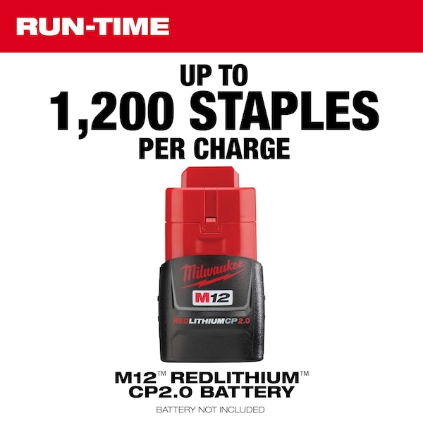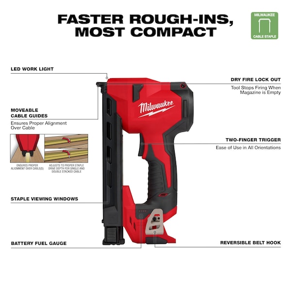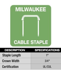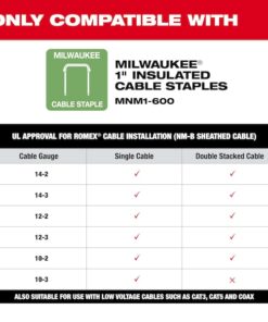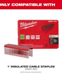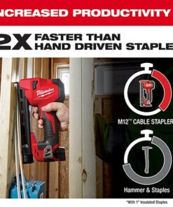 The MILWAUKEE M12 Cable Stapler delivers unmatched stapling performance in the most compact battery-powered solution leading to a faster, more efficient rough-in process. The compact, lightweight design provides users with access to tight stud bays and improved ergonomics when stapling overhead or during difficult-to-reach situations. Moveable cable guides ensure proper alignment and the coil-spring mechanism consistently sinks the staples to the appropriate depth when fastening NM-B Sheathed Cable (14, 12, 10 AWG) and low voltage cables, supporting peak stapling productivity. Only compatible with the Milwaukee 1″ insulated staples (sold separately), the M12 Cable Stapler gives the user the run-time needed to sink up to 1,200 staples on a fully charged M12 CP2.0ah battery.