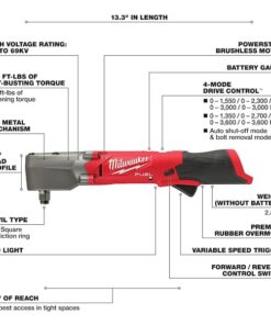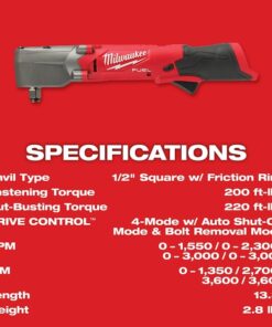 M12 FUEL 1/2″ Right Angle Impact Wrench w/ Friction Ring is the industry’s most powerful right angle impact wrench. You??ll be able to easily remove stubborn bolts and fasteners with up to 220 ft-lbs. of nut-busting torque without kickback. This cordless right angle impact wrench also gives you maximum access with ultimate control in hard to reach applications. durable cordless impact wrench easily fits into tighter spaces than traditional pistol-grip impact wrenches with a profile head of only 2.2??.This allows you to be more productive by decreasing your need for socket extensions often used with pistol-grip impact tools. The 4-Mode Drive Control delivers unmatched control in various fastening and bolt removal applications. Modes 1-3 provide RPM and IPM adjustments for maximum precision, and Mode 4 is equipped with Auto Shut-off in forward and Bolt Removal Mode in reverse. Auto Shut-off Mode will prevent over-tightening of bolts by applying no more than 15 ft-lbs. of torque. Bolt Removal Mode provides more control by drastically slowing down RPMs once the bolt is loosened. The REDLINK PLUS Intelligence ensures you achieve maximum performance and protection against overloads, over-heating, and over-discharge. This cordless 1/2?? impact wrench is powered by MILWAUKEE M12 REDLITHIUM Battery Packs (not included), which are compatible with all M12 tools, delivering more work per charge and more work over the life of the pack.