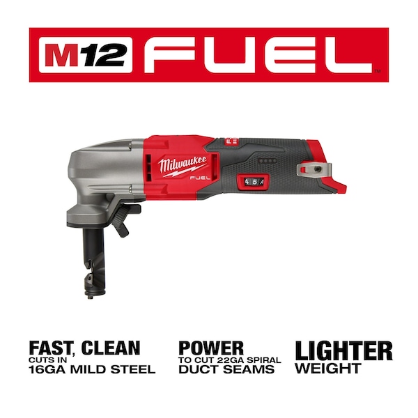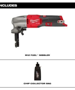 M12 FUEL 16-Gauge Variable Speed Nibbler is a compact light weight tool that provides the same cutting capacity as its 18V competitors on a 12V system. Delivering fast clean cuts in 16-gauge mild steel, the nibbler is rated for 18-gauge stainless steel and 12-gauge aluminum. M12 FUEL 16-Gauge Variable Speed Nibbler has the power to perform in heavy applications such as cutting up to 22-gauge spiral duct seams. The nibbler tool provides a variable speed dial, tool-free die holder orientation change, and LED work light offers maximum control and productivity. The unique chip collection bag, kitted with the tool, reduces jobsite cleanup. compact and light weight form factor enables greater access and mobility on the jobsite.