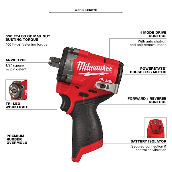 The new MILWAUKEE? 1/2″ Stubby Impact Wrench w/ Pin Detent delivers the Most Power, Is Lighter Weight & More Compact while delivering 50% Faster Application speeds. Leveraging POWERSTATETM Brushless Motor, The Stubby Delivers 0-3,000 RPM with up to 550 ft-lbs of Nut Busting Torque, allowing the removal of the most corroded and stubborn applications. This Milwaukee? solution delivers on performance and size, at only 2.2 lbs bare tool. Users will experience less fatigue throughout their work week while fitting into tight spaces and allowing access where larger impacts can’t fit without using additional accessories or disassembling components to reach the desired fastener. Equipped with Tri LED work lights to illuminate your work area without the frustration of shadows. 4-Mode DRIVE CONTROLTM for greater precision and customization to your desired power output, including AUTO SHUT-OFFTM that applies no more than 15 ft-lbs of torque for hand-tight applications that prevent overtightening when in forward. In reverse, bolt removal mode will slow down the RPM once the bolt is free to prevent bolts from flying around your work area. To change the modes, it is a single-handed operation. By shifting the forward-reverse shuttle into neutral and double-tapping the trigger, you will be able to change modes effortlessly.