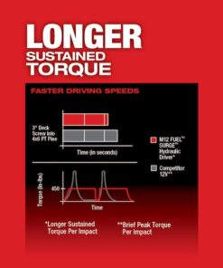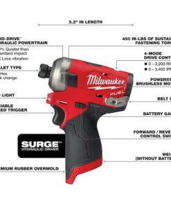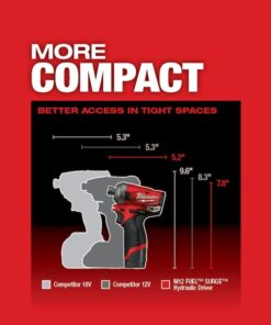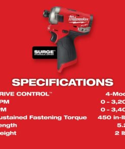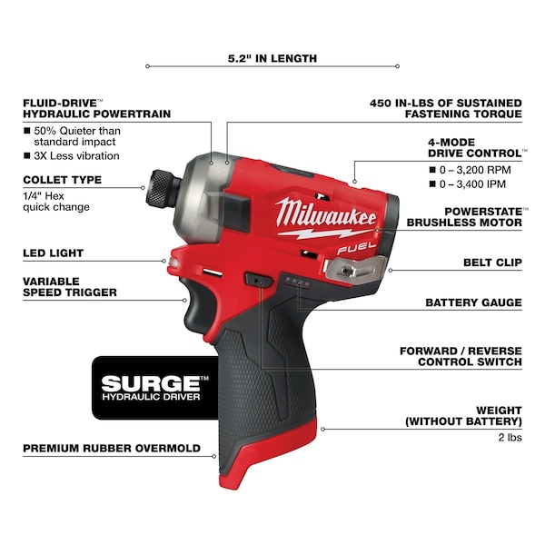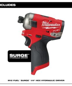 M12 FUEL SURGE 1?4?? Hex Hydraulic Driver is the industry’s first 12-volt hydraulic driver. Featuring FLUID-DRIVE Hydraulic Powertrain, the hydraulic driver will let you experience operation up to 2X quieter with less vibration for smoother and faster driving speeds compared to standard impacts. The compact size of the tool and battery give you unmatched access in tight spaces and allows for easy transport on a tool belt and easy fitting into your job site tool bag. The POWERSTATE Brushless Motor delivers up to 0-3,200 RPM with constant power output to drive screws faster. Built-in REDLINK PLUS Intelligence is the most advanced electronic system on the market, preventing damage to your tool and battery caused by overloading or overheating. The cordless hydraulic driver is compatible with all Milwaukee M12 REDLITHIUM Compact Batteries or Extended Capacity Batteries, providing you with more work per charge and more work over the life of the pack than competitive batteries. The impact driver’s 4-Mode DRIVE CONTROL gives you greater control over output speed and power for greater versatility in a wide range of applications. Self-Tapping Screw Mode reduces walking when you are self-tapping screws as well as reduces overdriving, breaking and stripping out screws.