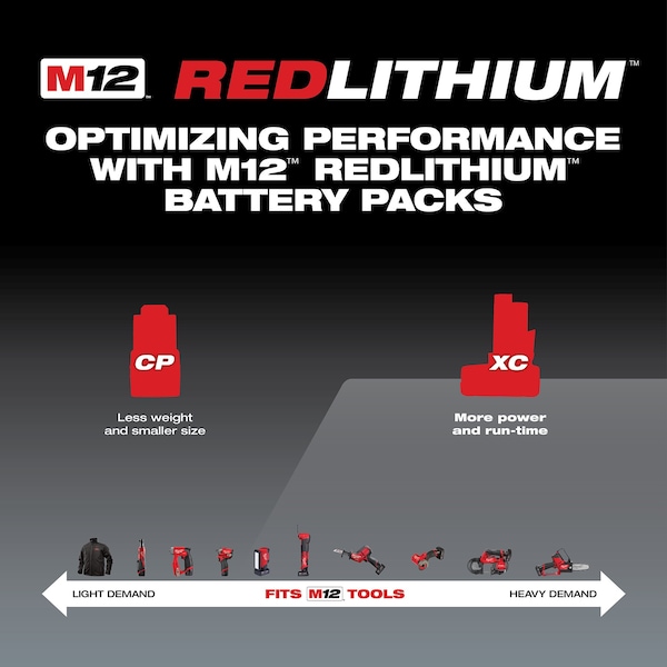 Delivers up to 3X more runtime, 20% more power and 2X more life than standard lithium-ion batteries. The M12 REDLITHIUM XC6.0 compact battery pack features superior pack construction, electronics and performance to deliver more work per charge and more work over the life of the pack than any battery on the market. With Milwaukee durability built into each pack, this battery runs cooler and performs in climates below 0??F/-18??C. Managed by Milwaukee’s exclusive REDLINK Intelligence, the battery features overload protection to prevent you from damaging your cordless power tools in heavy-duty situations, while the discharge protection prevents cell damage. The temperature management system and individual cell monitoring help maximize battery life. Upgrade to the M12 REDLITHIUM XC6.0 extended capacity battery pack to instantly increase the runtime and durability of your Milwaukee M12 cordless tools.