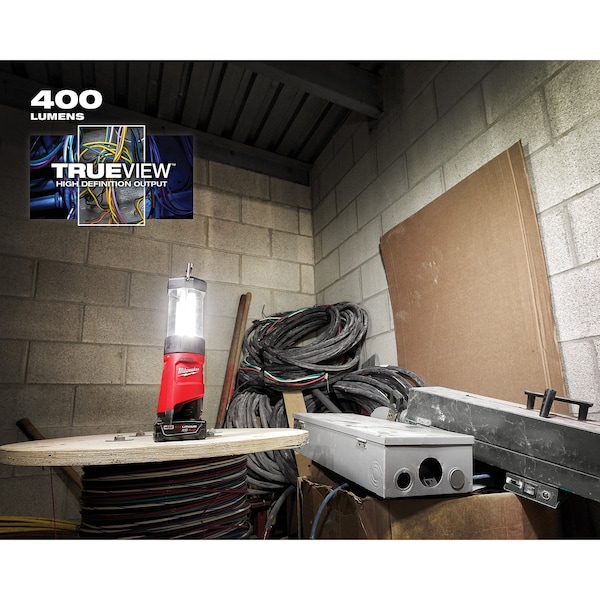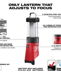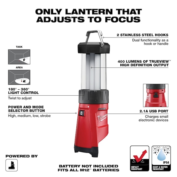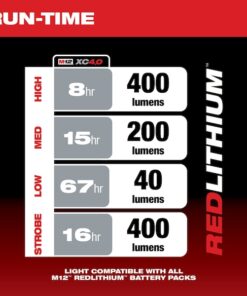 Work Light, Battery Platform M12(TM), Series No Series, Light Output Mode High, Low, Medium, Strobe, Brightness Level 40 lm, 200 lm, 400 lm, Maximum Brightness Level 400 lm, Minimum Brightness Level 40 lm, Mount Type Hook, Maximum Height 10 5/8 in, Light Distribution 90 Degrees , Head Type Rotating, Maximum Head Rotation Angle 360 Degrees , Cordless Tool Kit Contents Bare Tool, Run Time 8 hr, 15 hr, 16 hr, 67 hr, Voltage 12V DC, Battery Included / Bare Tool Bare Tool, Beam Distance 49.21 ft