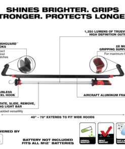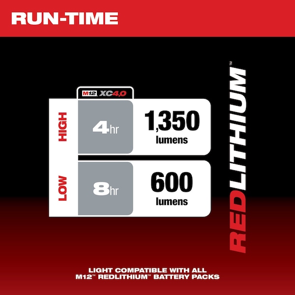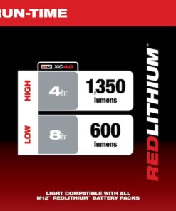 Underhood Light, Battery Platform M12(TM), Series No Series, Light Output Mode High, Low, Brightness Level 600 lm, 1,350 lm, Maximum Brightness Level 1,350 lm, Minimum Brightness Level 600 lm, Mount Type Hook, Maximum Height 9 in, Light Distribution 90 Degrees , Head Type Rotating, Maximum Head Rotation Angle 360 Degrees , Cordless Tool Kit Contents Bare Tool, Run Time 4 hr, 8 hr, Voltage 12V DC, Battery Included / Bare Tool Bare Tool, Compatible Battery Capacity 4 Ah