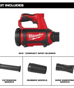 M12 Compact Spot Blower delivers more control and faster cleanup. It features high and low-speed settings, a lock-on button, and a variable speed trigger for increased control during jobsite cleanup. The M12 Compact Spot Blower??s compact size allows for greater access, maneuverability in tight spaces, and easy storage. The axial fan provides the best combination of power and run-time with 175 CFM and 110 MPH of air speed. The M12 Compact Spot Blower includes two nozzles. The rubber nozzle removes debris from hard-to-reach spaces. The wide sweeping nozzle efficiently clears debris in open spaces. The M12 Compact Spot Blower is ideal for jobsite debris removal and workbench cleanup. The MILWAUKEE M12 Compact Spot Blower is fully compatible with 100+ solutions on the M12 System.