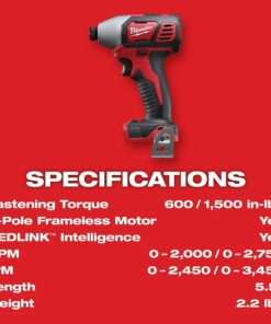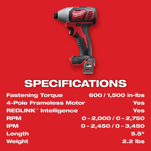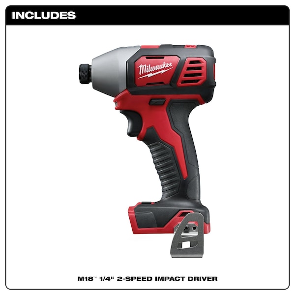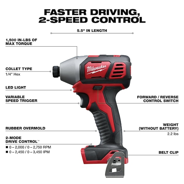 The M18 2-Speed 1/4″ Hex Impact Driver is the most powerful 1/4″ hex compact impact driver in its class and offers the best power to size ratio among like competitors. Featuring a Milwaukee built 4-Pole frameless motor and optimized impact mechanism, this impact driver delivers up to 2,750 RPM, 3,450 IPM and 1,500 in-lbs of fastening torque for class-leading performance. This is the only tool in its class to offer multiple speed/torque modes through proprietary 2-Mode Drive Control. REDLINK Intelligence provides optimized performance and overload protection using total system communication between tool, battery and charger. The M18 1/4″ Hex Impact Driver features an LED Light to illuminate work surfaces, and includes an all-metal, reversible belt clip for temporary tool storage.