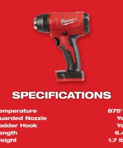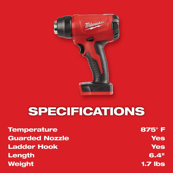 The M18 compact heat gun performs applications quickly by reaching operational temperature in less than 7 seconds. As the most compact cordless heat gun in the market, it can go places where corded heat guns can??t. The guarded nozzle and ladder hook prevent the tool from coming in contact with unprotected surfaces. Powered by REDLITHIUM battery technology, it is able to heat over 40 connections on a single XC5.0 battery, anywhere, anytime without the hassle of cords. The M18 compact heat gun features REDLINK Plus intelligence with a temperature management system to provide maximum life.