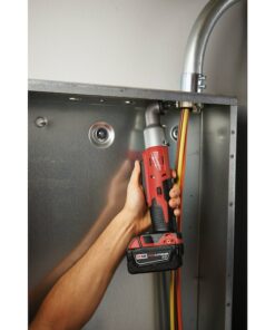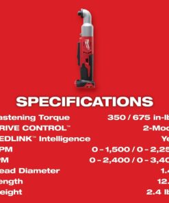 The M18 2-Speed 1/4″ Hex Right Angle Impact Driver offers users maximum access, and ultimate speed & control over their hard to reach fastening applications. Its 1.7″ head profile fits where pistol-grip impact drivers cannot, and its extended paddle switch allows trademen to operate their tool from multiple grip points. This is the only tool in its class to offer multiple speed/torque modes through proprietary 2-Mode Drive Control. REDLINK Intelligence provides optimized performance and overload protection using total system communication between tool, battery and charger. The M18 2-Speed 1/4″ Hex Right Angle Impact Driver features an LED Light to illuminate work surfaces.