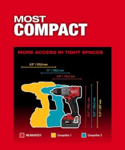 The MILWAUKEE M18 FUEL 1/2″ Drill Driver is the Industry’s Most Powerful Drill, Most Compact solution in class and features AutoStop Control Mode for Enhanced Safety. Delivering the capability to drill the largest holes at high speed into the densest materials. The POWERSTATE Brushless motor delivers the most power under load to complete 2-9/16″ Self-Feed holes in dense woods for increased productivity. At only 6.9″ in length, this is the most compact cordless drill driver in its class for the best access and maneuverability in tight spaces. The AutoStop Control Mode offers enhanced safety for the operator by preventing over-rotation in a bind-up with the best reaction time in the industry. The REDLINK PLUS intelligence ensures maximum performance and protects from overloads, heating, and over-discharge. The MILWAUKEE M18 REDLITHIUM battery packs deliver more work per charge and more work over the life of the pack when compared to competitors. The all metal ratcheting chuck is the best-in-class. This provides increased grip strength, durability and corrosion resistance.