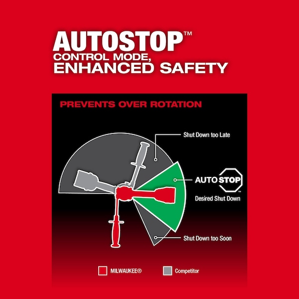 - Auto-Stop Feature to Protect from over-rotation in a bind-up for enhanced safety, equipped with a dedicated autostop light on foot of tool to indicate a protection event