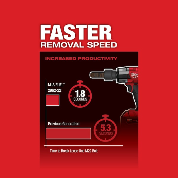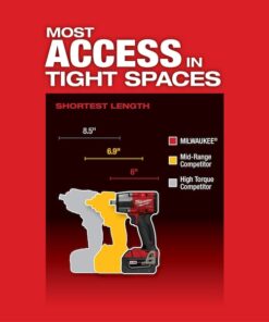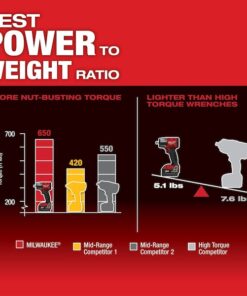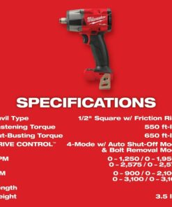 M18 FUEL 1/2″ Mid-Torque Impact Wrench w/ Friction Ring delivers the best power to weight ratio, most access in tight spaces, and faster removal speed. It provides 650 ft-lbs of nut-busting torque and only weighs 5.1 lbs, making it extremely versatile, capable of performing a wide variety of applications. Its POWERSTATE Brushless Motor generates the power needed to quickly perform many tasks, such as removing large bolts or lug nuts. This MILWAUKEE 1/2″ Impact Wrench is the most compact in its class, giving you access to stubborn fasteners in spaces where larger impact wrenches can??t fit without needing to disassemble components to reach bolts. Tri-LEDs surround the anvil to deliver brighter light with fewer shadows. 4-Mode DRIVE CONTROL offers greater precision with a range of pre-set RPM and IPM levels, selectable from a single button on the tool. By selecting Mode 4, AUTO SHUT-OFF control applies no more than 35 ft-lbs of torque for hand-tight fastening applications to prevent overtightening. Mode 4 also features Bolt Removal Control that delivers you full torque output, then decreases RPMs once the bolt is loosened to prevent fastener drops. REDLINK PLUS Intelligence ensures maximum performance, protecting the tool against overloads, over-heating, and over-discharge. The M18 REDLITHIUM battery pack (not included) fits M18 tools, delivering more work per charge and more work over the life of the pack.
