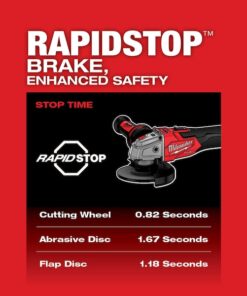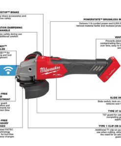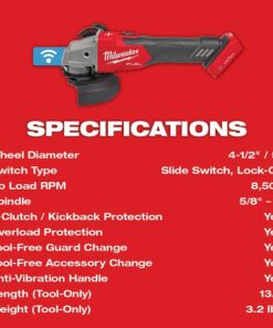 M18 FUEL 4-1/2″ / 5″ Braking Grinder with ONE-KEY Slide Switch, Lock-On is the next advancement in power and performance of cordless grinders while enhancing safety with its RAPIDSTOP Brake. The M18 FUEL 4-1/2″ / 5″ Braking Grinder with ONE-KEY generates 11A corded power to complete the toughest grinding and cutting applications. The POWERSTATE Brushless Motor delivers maximum sustained power and 8,500 RPM to remove material faster and increase productivity. REDLINK PLUS Intelligence ensures unmatched levels of performance, protection, and compatibility. The RAPIDSTOP Brake provides stop times under 2 seconds with an abrasive disc. M18 FUEL 4-1/2″ / 5″ Braking Grinder with ONE-KEY includes an electronic clutch for kickback protection, as well as overload protection to maximize motor life. Compatible with ONE-KEY, this grinder wirelessly connects to a smartphone to track and manage the tool, providing you with visibility to where tools are across your network of jobs. The M18 REDLITHIUM HIGH OUTPUT XC6.0 Batteries (not included) deliver 50% more power while running 50% cooler than the M18 REDLITHIUM XC Batteries. Experience faster accessory changes, and less downtime with tool-free accessory and guard adjustments, while remaining fully compatible with the most common accessories in the market. The MILWAUKEE M18 FUEL 4-1/2″ / 5″ Braking Grinder with ONE-KEY is the next level of jobsite productivity and enhanced safety in cordless grinders.