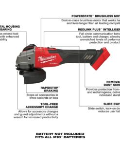 Angle Grinder, Head Type Standard Head, Voltage 18V DC, Wheel Diameter 4 1/2 in, 5 in, For Wheel Type Type 1, Type 27, Brushless Motor Yes, Cordless Tool Kit Contents (1) Bare Tool, Safety Features Adjustable Guard, Anti-Kickback Clutch, Brake, Lock-On Switch, Switch Type Slide, Lock-Off Switch No, Lock-On Switch Yes, Brake Type Electronic, Switch Location Top, Max. Speed 8,500 RPM, Minimum Speed 3,500 RPM, Speed Ranges 0 to 3,500/8,500 RPM, Number of Speed Settings Continuous