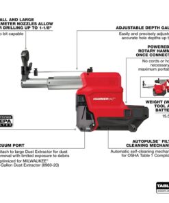 Dust Extractor, Dust Compartment Type Self-Contained, OSHA Table 1 Compliant OSHA Table 1 Compliant, Extractor Mounting Location On-Tool, Compatible Chuck Style SDS-Plus, Application Concrete Drilling, Dust Extraction, Wet or Dry Use Dry, Filtration Type HEPA, Product Type On-Tool Dust Extractor, Compatible with Manufacturer Part Number 2915-20, Battery Series M18(TM) REDLITHIUM(TM), Kit Contents (1) Dust Extractor, (1) Large Diameter Nozzle, (1) Small Diameter Nozzle
