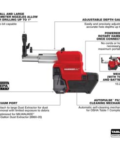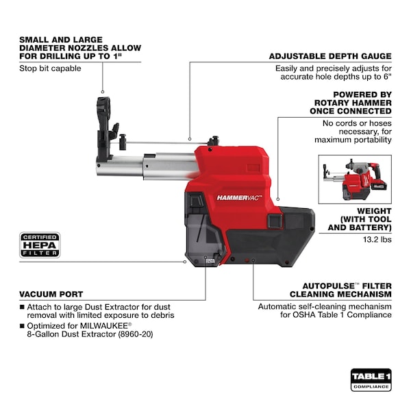 HAMMERVAC 1 in. Dedicated Dust Extractor (2912-DE) features an inline design engineered to connect directly to and be power by the MILWAUKEE M18 FUEL 1 in. SDS Plus Rotary Hammer (2912-20 and 2914-20). Utilizing the same replaceable certified HEPA filter as other HAMMERVACS, which filters 99.97% of all particles greater than 0.3??m, means more compatibility on the jobsite. The built-in adjustable depth stop and ruler offers easy and precise adjustments. The dust extractor allows full OSHA Table One Compliance when drilling up to 1 in. diameter and 6 in. in depth. This extractor features AUTOPULSE Filter Cleaning Mechanism that automatically cleans the filter after each use, ensuring you drill more effectively and for longer before needing to empty the dust box. The dust box comes equipped with a vacuum port that allows you to suction out the dust with a large vacuum or dust extractor (such as the 8960-20) instead of dumping the dust out into a trash receptacle, ensuring minimal exposure.