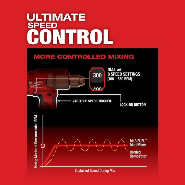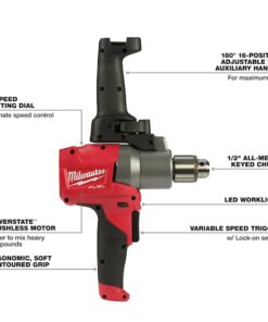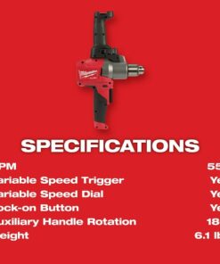 The M18 FUEL Mud Mixer with 180?? handle is the industry??s first dedicated cordless solution that delivers the performance and durability to fully replace corded mixers. With the POWERSTATE Brushless motor it has the power to mix heavy compounds, such as concrete and mortar. Using REDLINK intelligence the variable speed dial, the variable speed trigger and the lock on button combine to give the user ultimate control for a consistent mix and cleaner working environment. With the M18 REDLITHIUM battery the user can mix up to 15, five gallon buckets on one 5.0Ah battery. The 180?? adjustable handle is designed to allow every user to optimize the handle position for their comfort. This Milwaukee cordless solution increases productivity by eliminating the need for cords and allows the user to mix the material at the workspace where it is being applied.