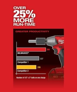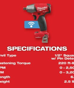 The M18 FUEL 1/2?? Compact Impact Wrench is the Most Powerful tool in its class, delivering up to 220 ft-lbs of torque in a compact design. The POWERSTATE Brushless Motor not only provides unmatched power, but also greater efficiency, delivering up to 25% more run-time than the leading competitors. REDLINK PLUS Intelligence is the most advanced electronic system on the market, preventing damage to the tool and battery caused by overloading or overheating. REDLITHIUM Batteries deliver more work per charge and more work over the life of the pack than competitive batteries on the market.Compatible with ONE-KEY, this is the industry??s first Impact Wrench that wirelessly connects to a smart phone to Customize, Track and Manage a tool??s performance and location. Unlimited Tool Customization allows you to connect to the tool and access predetermined set-ups for specific fasteners and materials, or have complete control over output speed and power for the specific application at hand. Once the desired output performance is reached, the custom profile is then saved to the memory of the tool and the connection to the smart phone is no longer necessary. The tool??s memory supports up to 4 custom profiles that can be easily accessed with the touch of a button on the tool. Your custom profiles are also saved in the cloud so that they can be accessed at any time. Integrated Tool Tracking, also available through ONE-KEY, provides full visibility to how and where tools are being used across your network of jobs and users. The app will track all ONE-KEY compatible devices within 100 ft range of your phone. By building the functionality into the tool, not the battery, all devices are trackable even if the battery is not charged or on the tool. The app will automatically keep records of the last time a tool was within range of the app, allowing you to pinpoint missing tools quicker and increase accountability of your crew. If you??re having trouble locating a lost tool, expand your search with the help of anybody with the ONE-KEY app. By opting in, when any phone with the app comes within 100 ft of your tool, you will receive an updated location.