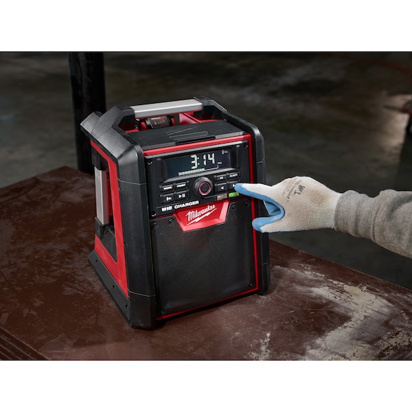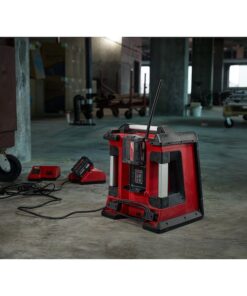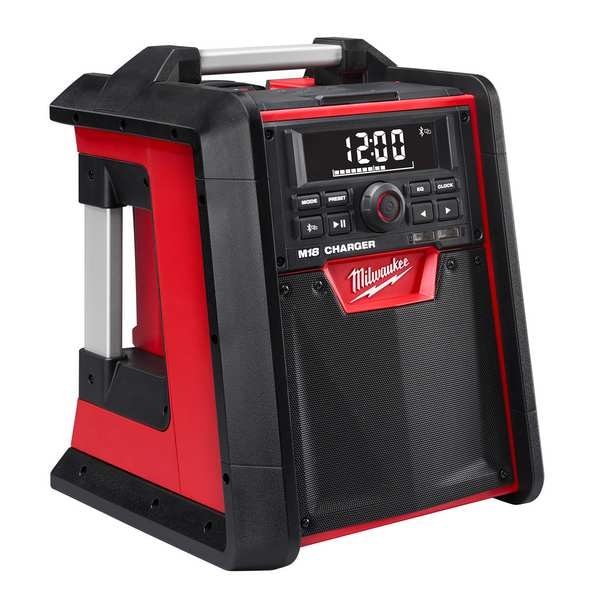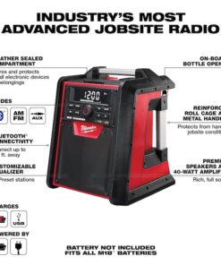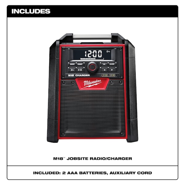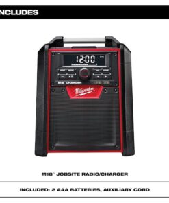 The Milwaukee M18 Jobsite Radio/Charger is the first charging radio to bring the power of Bluetooth to the jobsite, while delivering the industry’s best reception and sound. The most advanced radio of its kind, the M18 Jobsite Radio/Charger features a Bluetooth receiver so you can stream rich, full sound wirelessly from over 100 feet away. Its unique battery charger allows you to charge any M18 battery without sacrificing reception or sound quality. For added versatility, a high-power USB port allows you to charge most portable electronic devices over 50% faster than any competitor. The M18 Radio/Charger’s lightweight, high-strength design includes a reinforced roll cage for protection from weather and abusive jobsite conditions. The radio/charger also offers the industry’s largest on-board, weather-sealed storage compartment to protect your small belongings and smart phones. A 16″ auxiliary input cord and 2 AAA batteries are included.