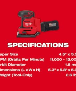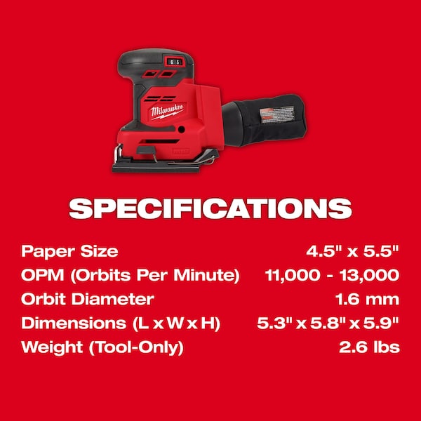 Sheet Sander, Power Source Cordless, Product Type Sheet Sander, Abrasive Shape Square, Sheet Size 4 1/2 x 5 1/2 in, Abrasive Mount Type Clamp, Speed Settings Variable, Maximum Orbits per Minute 13,000 OPM, Battery Platform M18(TM), Bare Tool/Battery Included Bare Tool, Number of Batteries Included 0, Battery Capacity Not Applicable, Number of Vacuum Holes 10, Dust Collection Port Type Universal, Orbit Size 0 in, Grip Type Palm, Voltage 18 V DC, Number of Chargers Included 0